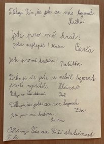„Chtěla jsem vám poděkovat za zrealizování soutěže Srdce s láskou darované. Samotné vyhlášení vítězů v Ypsilonce mě i paní třídní učitelku dívek z 9. B dojalo. Velice se mi líbí, že se nejednalo o ,samoúčelnou‘ soutěž, naopak, že měla další pokračování, překračovala jakési …